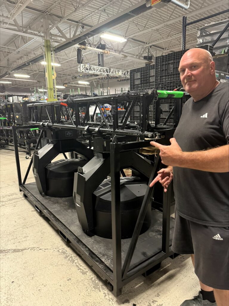 Striving for extra efficiency, Gateway was seeking to avoid having to store eight supersized flight cases as the show toured, let alone get them in and out on a daily basis. And so senior VP (and tour manager) Chad Fuller custom built a set cart which would enable the fixtures to stay mounted on the Tyler GT truss “without it hitting the ground and rolling the truss”.
