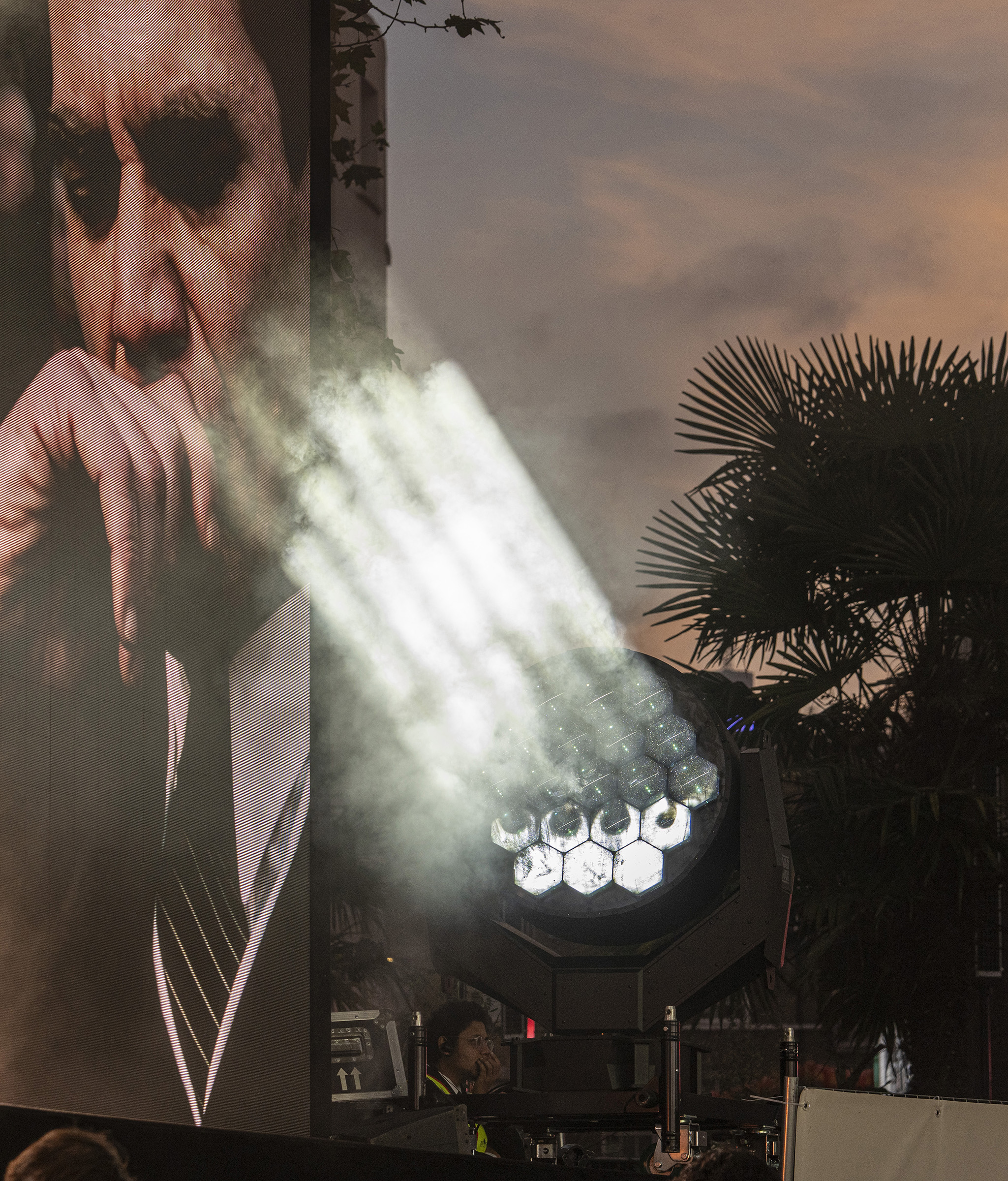 Because Nuremberg is a period event, Rich Godin wanted to explore the possibility of vintage tungsten emulation in the searchlights, and he was delighted to be able to recreate traditional seesawing moves. MAD MAXX comfortably achieves the tungsten effect – a warm, yellow-orange glow, around 2,500 K to 3,200 K – using its dedicated CTO (Change to Orange) dial on the built-in variable color temperature wheel. “So I could vary the temperature and warm the lighting up,” he explains. “As for the Bursts, I used RGBW LED plates to create warm white tones and mimic the tungsten look. It made it more authentic for the period.”
