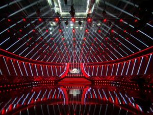 “The X4 matrix serves as a show and key light. The two-dimensional division of the devices allows each position to be illuminated individually in a relaxed manner. The impression S350 spots, on the other hand, are used for fixed moderation positions and are occasionally used to emphasize smaller objects. Since these positions are fixed in advance, the S350 can be planned accordingly.
